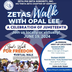 Register to walk virtually with our Soror Dr. Opal Lee and The Germany Zetas from any location or join Opal’s Walk Live events in a city near you. Join to support her continued mission to support the National Juneteenth Museum and educate the country about freedom and Juneteenth’s power to heal America.